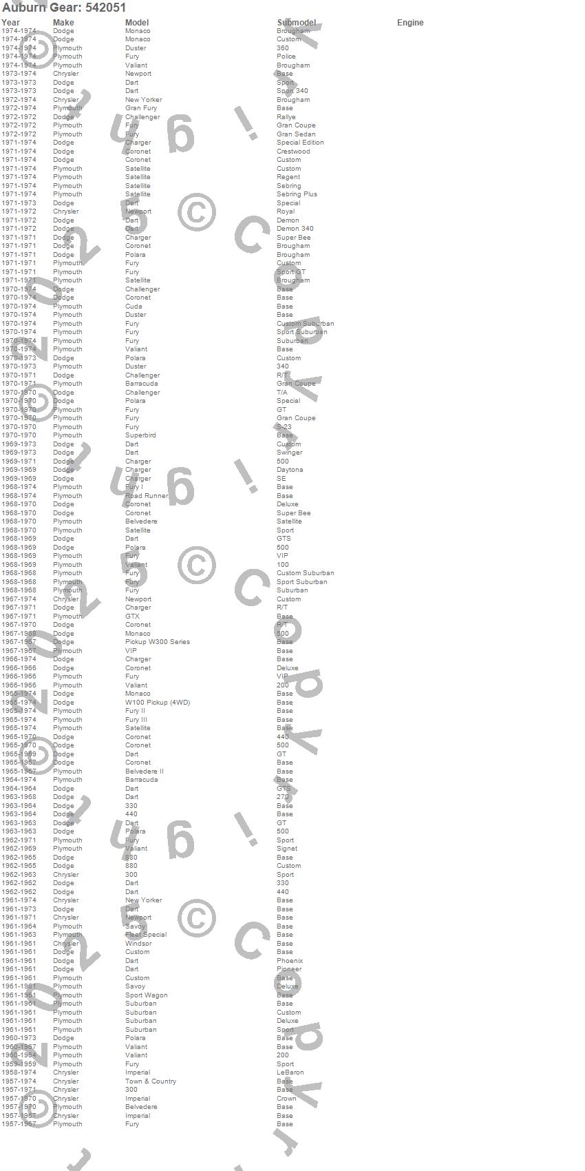 300, 330, 440, 880, Barracuda, Belvedere, Belvedere II, Challenger, Charger, Coronet, Cuda, Custom, Dart, Duster, Fleet Special, Fury, Fury I, Fury II, Fury III, Gran Fury more…