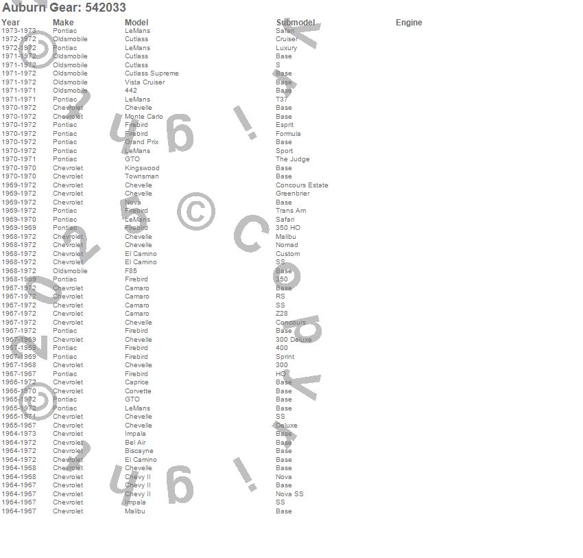 442, Bel Air, Biscayne, Camaro, Caprice, Chevelle, Chevy II, Corvette, Cutlass, Cutlass Supreme, El Camino, F85, Firebird, Grand Prix, GTO, Impala, Kingswood, LeMans, Malibu, Monte Carlo more…