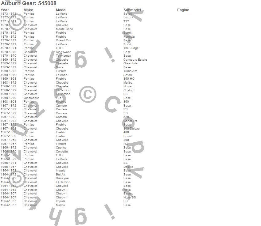 Bel Air, Biscayne, Camaro, Caprice, Chevelle, Chevy II, Corvette, El Camino, F85, Firebird, Grand Prix, GTO, Impala, Kingswood, LeMans, Malibu, Monte Carlo, Nova, Townsman, Chevrolet more…