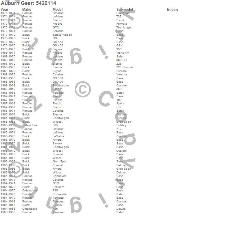 Bonneville, Catalina, Catalina Ventura, Electra, Estate Wagon, F85, Firebird, Gran Sport, GS, GS 350, GS 400, GS 455, GTO, LeMans, LeSabre, Riviera, Skylark, Special, Sportwagon, Tempest more…