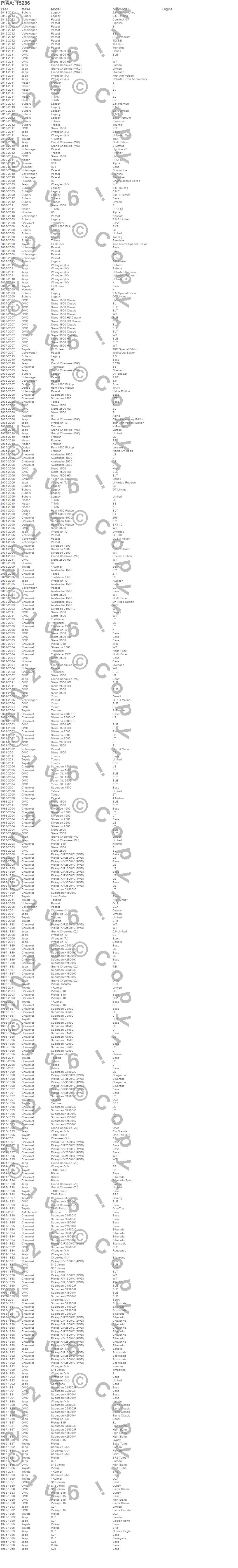 4Runner, Avalanche 1500, Avalanche 2500, C1500, C1500 Pickup, C1500 Suburban, C2500 Pickup, C2500 Suburban, C3500 Pickup, Cherokee, Cherokee (XJ), CJ6, CJ6A, CJ7, Comanche, Cooper, FJ Cruiser, Frontier, Grand Cherokee, Grand Cherokee (WJ) more…