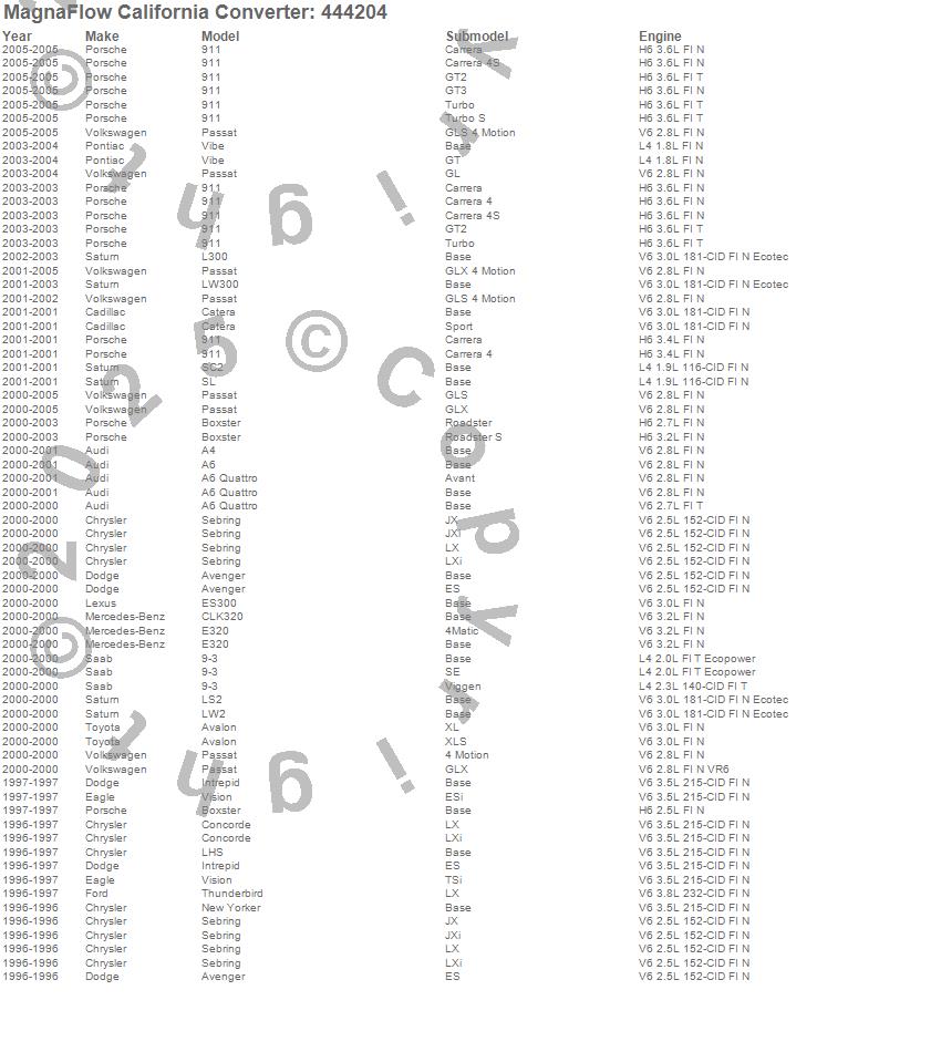 Below is an abreviated list of applications for the Universal California Catalytic Converter.