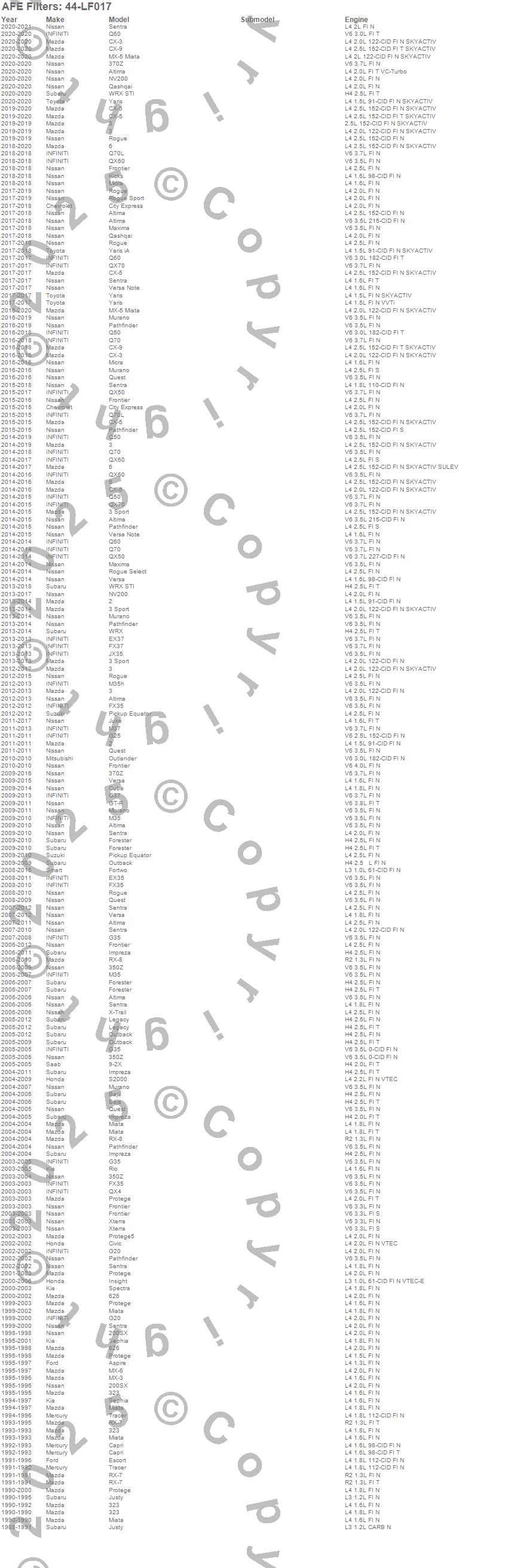 Below is an abreviated list of applications for the Pro-GUARD D2 Oil Fluid Filter.