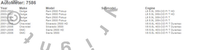 Below is an abreviated list of applications for the Phantom II Fuel Rail Pressure Gauge.
