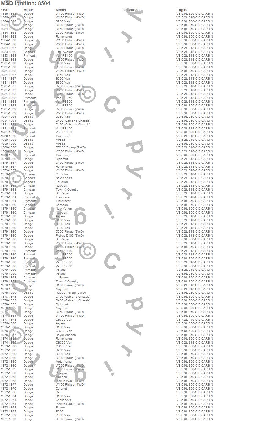 Aspen, B100 Van, B150 Van, B200 Van, B250 Van, B300 Van, B350 Van, CB300 Van, Challenger, Charger, Cordoba, Coronet, D100 Pickup, D150 Pickup, D200 Pickup, D250 Pickup, D300 Pickup, D350 Pickup, D450 Pickup, Dart more…