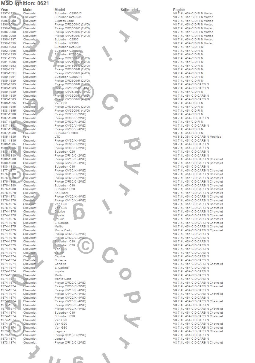 Bel Air, Blazer K5, C10 Pickup, C10 Suburban, C1500 Pickup, C20 Pickup, C20 Suburban, C2500 Pickup, C2500 Suburban, C30 Pickup, C3500 Pickup, Caprice, Corvette, El Camino, Express 3500, G20 Van, G30 Van, Impala, K10 Pickup, K20 Pickup more…