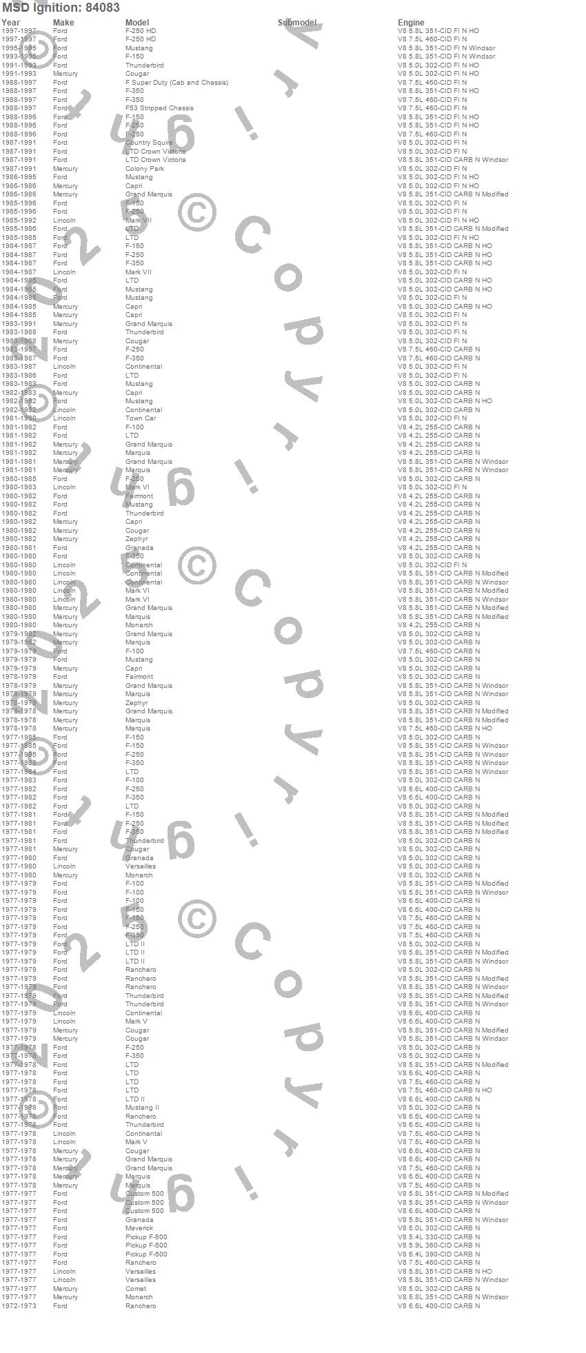 Capri, Colony Park, Comet, Continental, Cougar, Country Squire, Custom 500, F Super Duty, F-100, F-150, F-250, F-350, F-500 Pickup, F53, Fairmont, Granada, Grand Marquis, LTD, LTD Crown Victoria, LTD II more…
