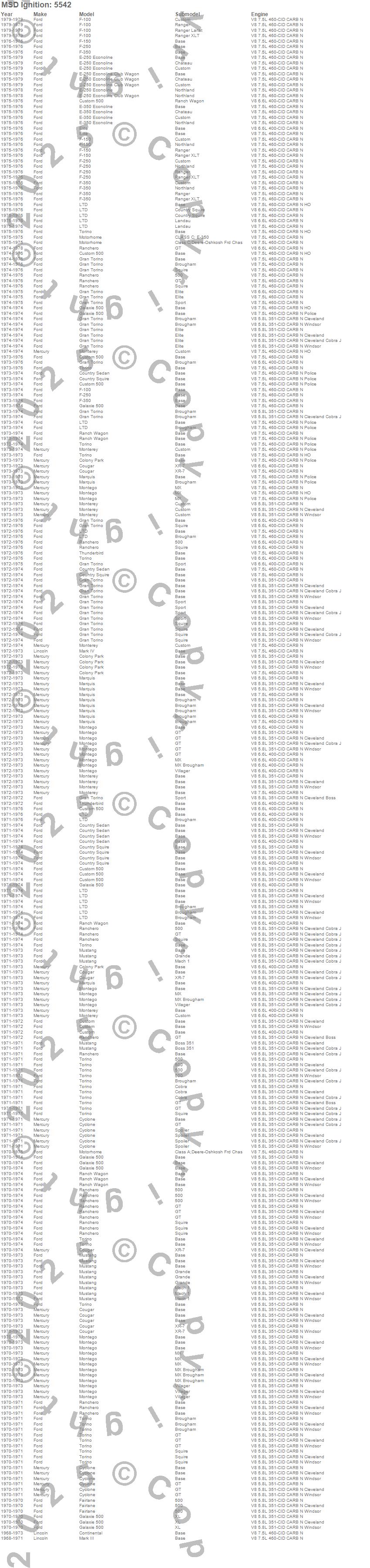 Colony Park, Continental, Cougar, Country Sedan, Country Squire, Custom, Custom 500, Cyclone, E-150 Econoline, E-250 Econoline, E-350 Econoline, Elite, F-100, F-150, F-250, F-350, Fairlane, Galaxie 500, Gran Torino, LTD more…