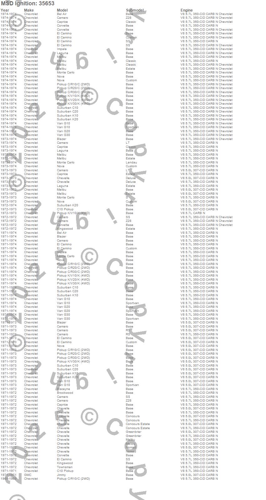 Bel Air, Biscayne, Blazer, Brookwood, C10 Pickup, C10 Suburban, C20 Pickup, C20 Suburban, C30 Pickup, Camaro, Caprice, Chevelle, Corvette, El Camino, G10 Van, G20 Van, G30 Van, Impala, Jimmy, K10 Pickup more…