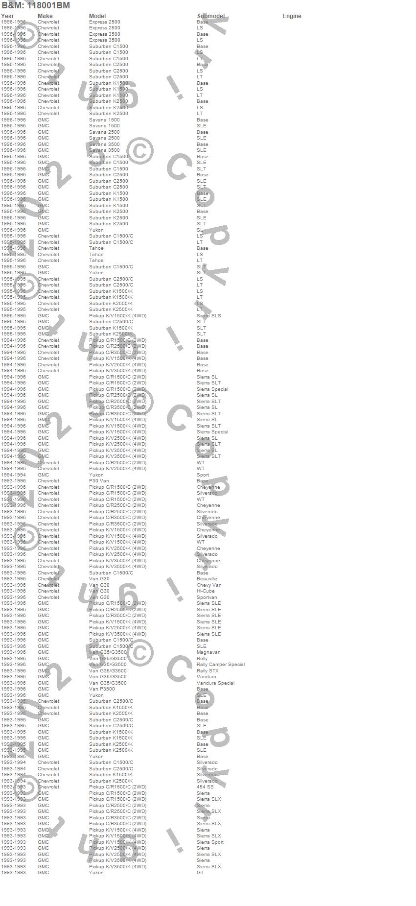 C1500, C1500 Pickup, C1500 Suburban, C2500 Pickup, C2500 Suburban, C3500 Pickup, Express 2500, Express 3500, G30 Van, G35/G3500 Van, K1500, K1500 Pickup, K1500 Suburban, K2500 Pickup, K2500 Suburban, K2500 Suburban (Canadian), K3500 Pickup, P30 Van, P3500 Van, Savana 1500 more…