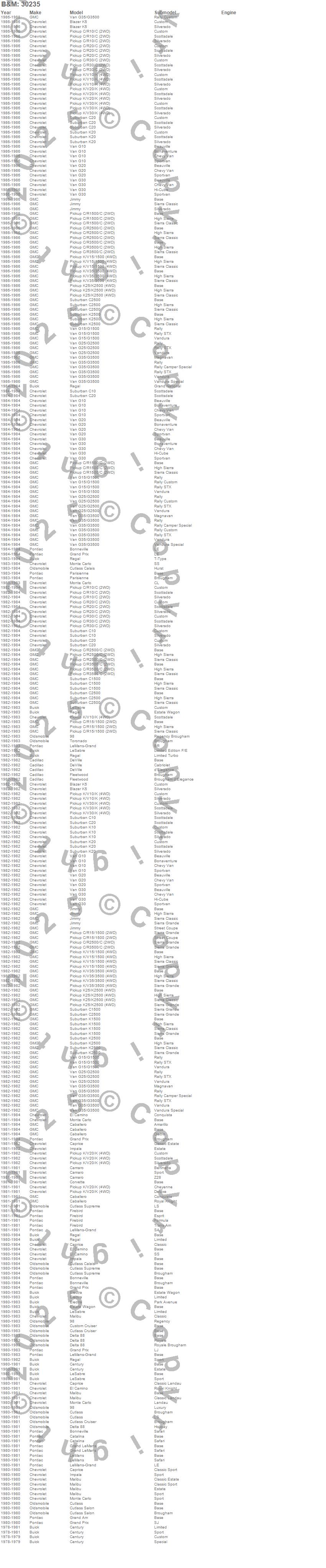 98, Blazer K5, Bonneville, C10 Pickup, C10 Suburban, C15/C1500, C1500, C1500 Suburban, C20 Pickup, C20 Suburban, C2500 Pickup, C2500 Suburban, C30 Pickup, C3500 Pickup, Caballero, Camaro, Caprice, Catalina, Century, Corvette more…