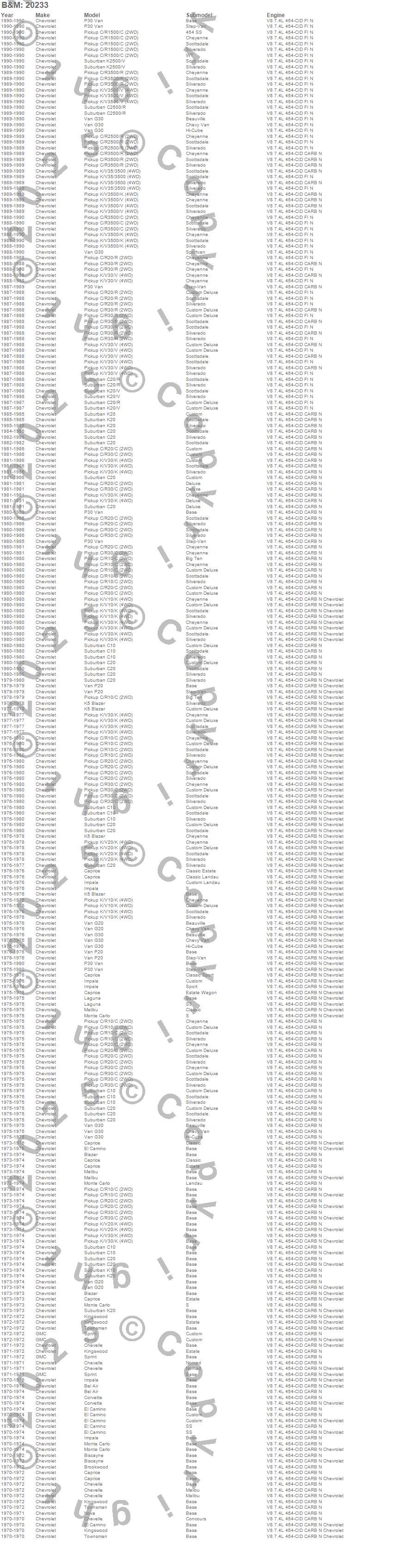 Bel Air, Biscayne, Blazer, Blazer K5, C10 Pickup, C10 Suburban, C1500 Pickup, C20 Pickup, C20 Suburban, C30 Pickup, C3500 Pickup, Caprice, Chevelle, Corvette, El Camino, G20 Van, G30 Van, Impala, K10 Pickup, K20 Pickup more…