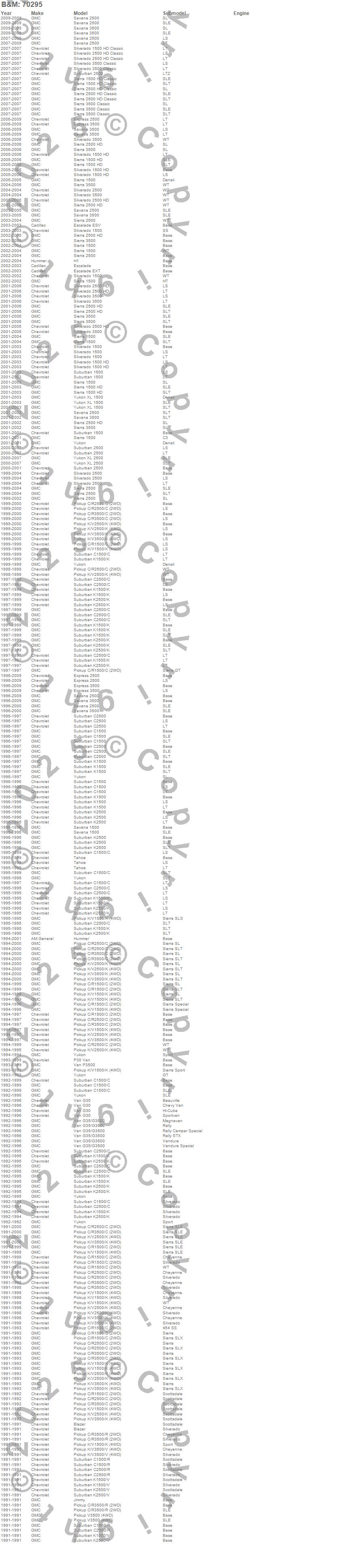 Avalanche 2500, Blazer, C1500, C1500 Pickup, C1500 Suburban, C2500 Pickup, C2500 Suburban, C3500 Pickup, Escalade, Escalade ESV, Escalade EXT, Express 2500, Express 3500, G30 Van, G35/G3500 Van, H1, H2, Hummer, Jimmy, K1500 more...