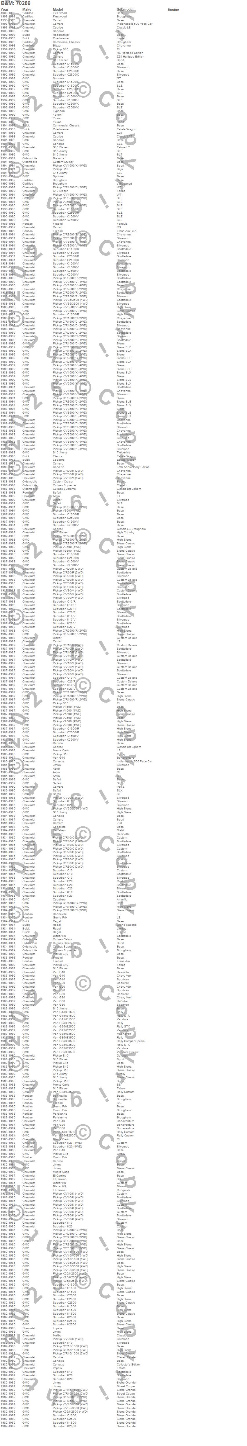 Astro, Blazer, Blazer K5, Bonneville, Caballero, Caprice, Corvette, Custom Cruiser, Cutlass Calais, Cutlass Supreme, El Camino, Electra, G10 Van, G15/G1500 Van, G20 Van, G25/G2500 Van, G30 Van, G35/G3500 Van, Grand Prix, Impala more…