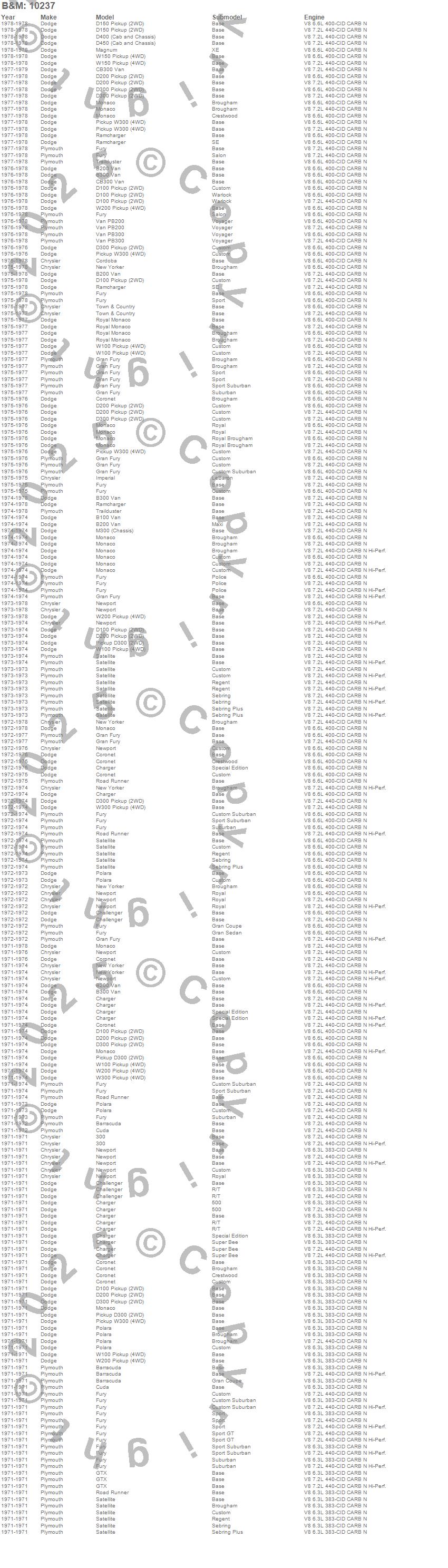 300, B100 Van, B200 Van, B300 Van, Barracuda, CB300 Van, Challenger, Charger, Cordoba, Coronet, D100 Pickup, D150 Pickup, D200 Pickup, D300 Pickup, D450 Pickup, Fury, Gran Fury, GTX, Imperial, Magnum more…
