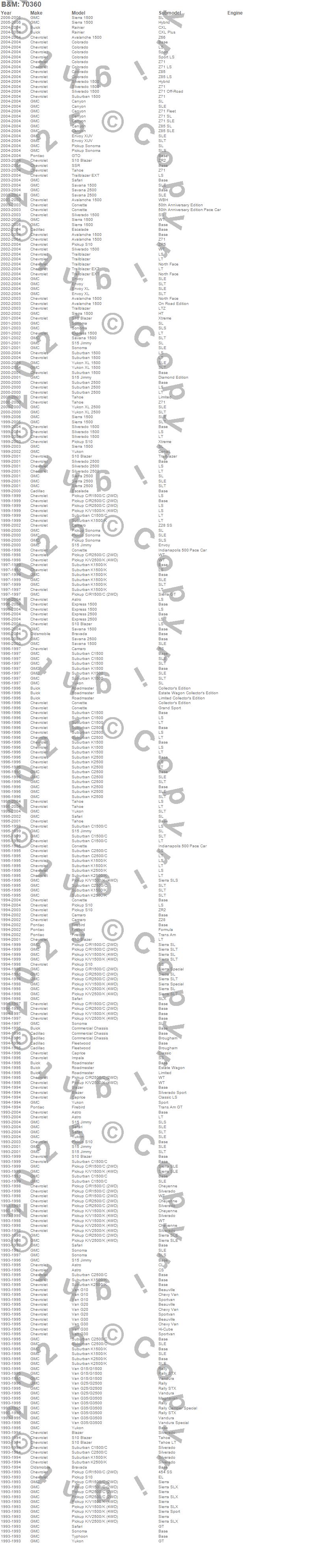 Astro, Avalanche 1500, Blazer, Bravada, C1500, C1500 Pickup, C1500 Suburban, C2500 Pickup, C2500 Suburban, Camaro, Canyon, Caprice, Colorado, Commercial Chassis, Corvette, Envoy, Envoy XL, Envoy XUV, Escalade, Express 1500 more…