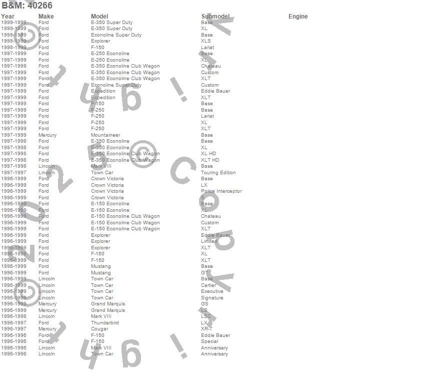 Cougar, Crown Victoria, E Super Duty, E-150 Econoline, E-150 Econoline Club Wagon, E-250 Econoline, E-350 Econoline, E-350 Econoline Club Wagon, E-350 Super Duty, Econoline Super Duty, Expedition, Explorer, F-150, F-250, Grand Marquis, Mark VIII, Mountaineer, Mustang, Thunderbird, Town Car more…