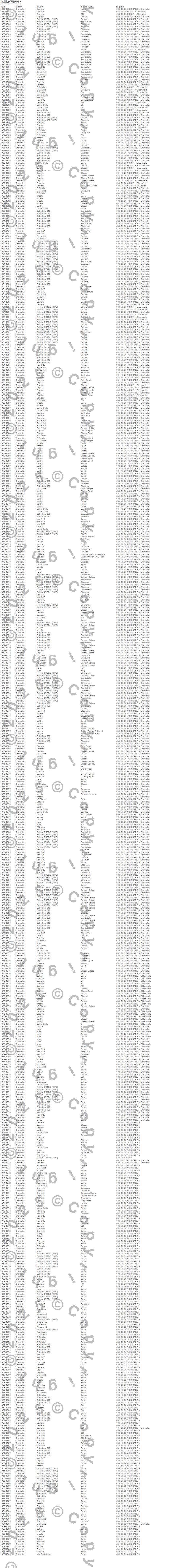 Bel Air, Biscayne, Blazer, Blazer K5, Brookwood, C10 Pickup, C10 Suburban, C20 Pickup, C20 Suburban, C30 Pickup, Camaro, Caprice, Chevelle, Chevy II, Corvette, Del Ray, El Camino, G10 Van, G20 Van, G30 Van more…