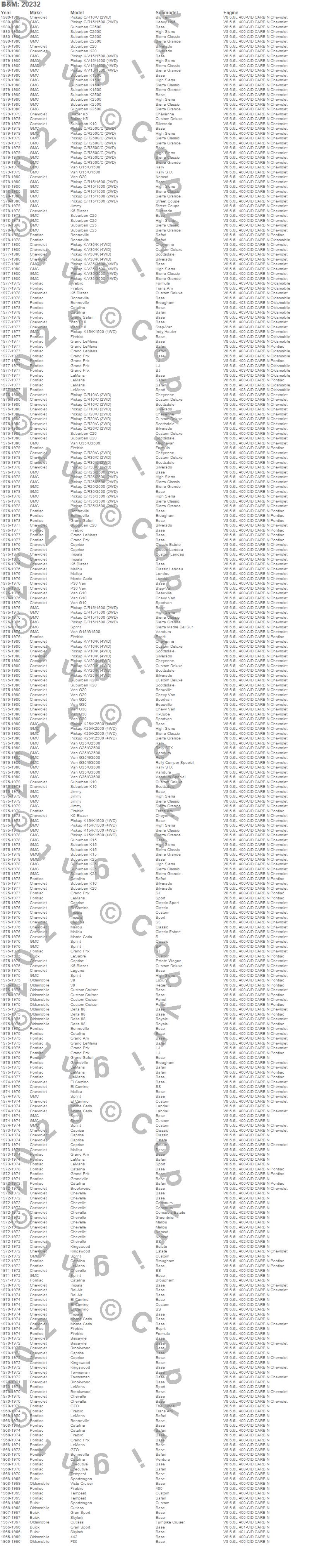 Bel Air, Biscayne, Blazer K5, Brookwood, C10 Pickup, C20 Pickup, C20 Suburban, C30 Pickup, Caprice, Chevelle, El Camino, G20 Van, G30 Van, Impala, K10 Pickup, K10 Suburban, K20 Pickup, K20 Suburban, K30 Pickup, Kingswood more…