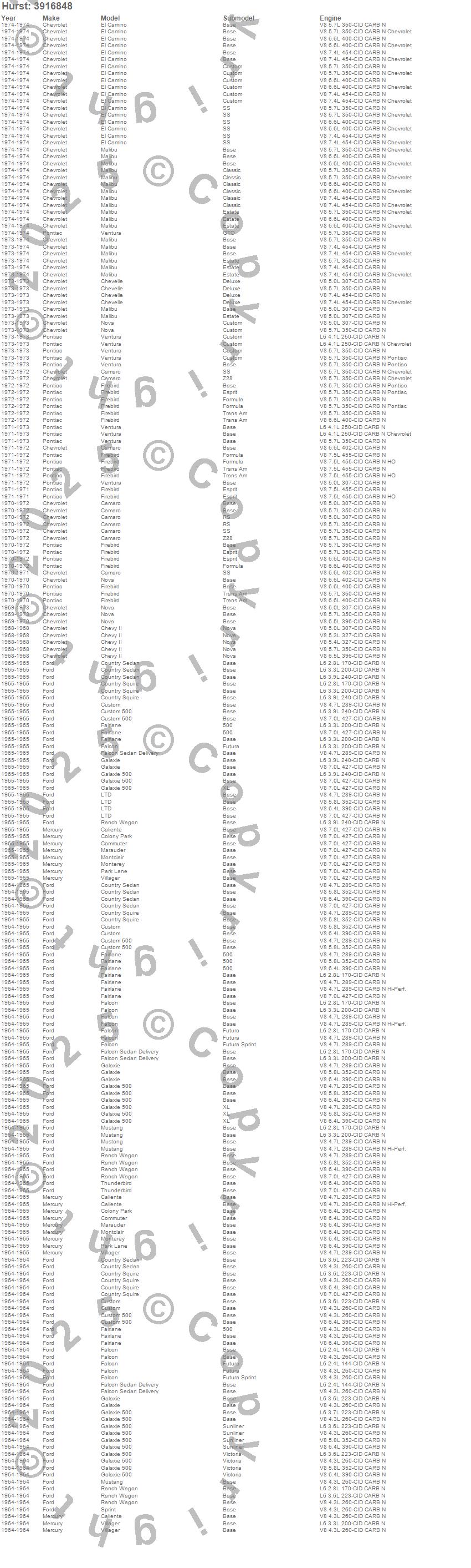 Breezeway, Caliente, Camaro, Chevelle, Chevy II, Colony Park, Commuter, Country Sedan, Country Squire, Custom, Custom 500, El Camino, Fairlane, Falcon, Falcon Sedan Delivery, Firebird, Galaxie, Galaxie 500, LTD, Malibu more…