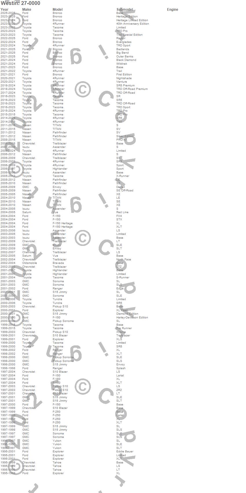 4Runner, Ascender, Bravada, Commander, Enclave, Envoy, Explorer, F-150, F-150 Heritage, F-250, Frontier, Grand Cherokee (WJ), Grand Cherokee (WK), Grand Cherokee (ZJ), Highlander, Pathfinder, Ram 1500, Ranger, S10 Blazer, S10 Blazer (Canadian) more…
