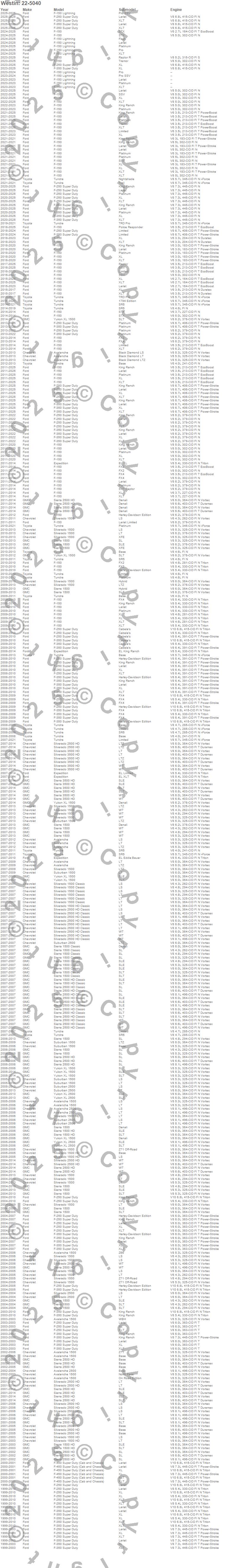 Avalanche, Avalanche 1500, Avalanche 2500, C1500 Suburban, C2500 Suburban, Expedition, F-150, F-250 Super Duty, F-350 Super Duty, F-450 Super Duty, F-550 Super Duty, K1500 Suburban, K2500 Suburban, Sierra 1500, Sierra 1500 HD, Sierra 2500 HD, Sierra 3500, Sierra 3500 HD, Silverado 1500, Silverado 1500 HD more…