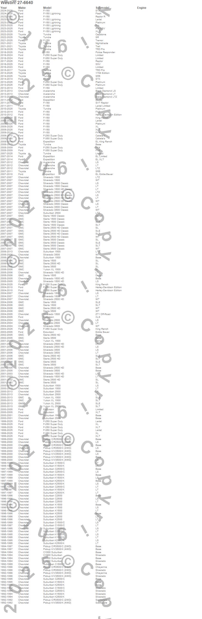 Ascender, Avalanche, Avalanche 1500, Avalanche 2500, C1500 Suburban, C2500 Pickup, C2500 Suburban, C3500 Pickup, Envoy XL, Excursion, Expedition, F-150, F-250 Super Duty, F-350 Super Duty, K1500 Suburban, K2500 Pickup, K2500 Suburban, K2500 Suburban (Canadian), K3500 Pickup, Mark LT more…