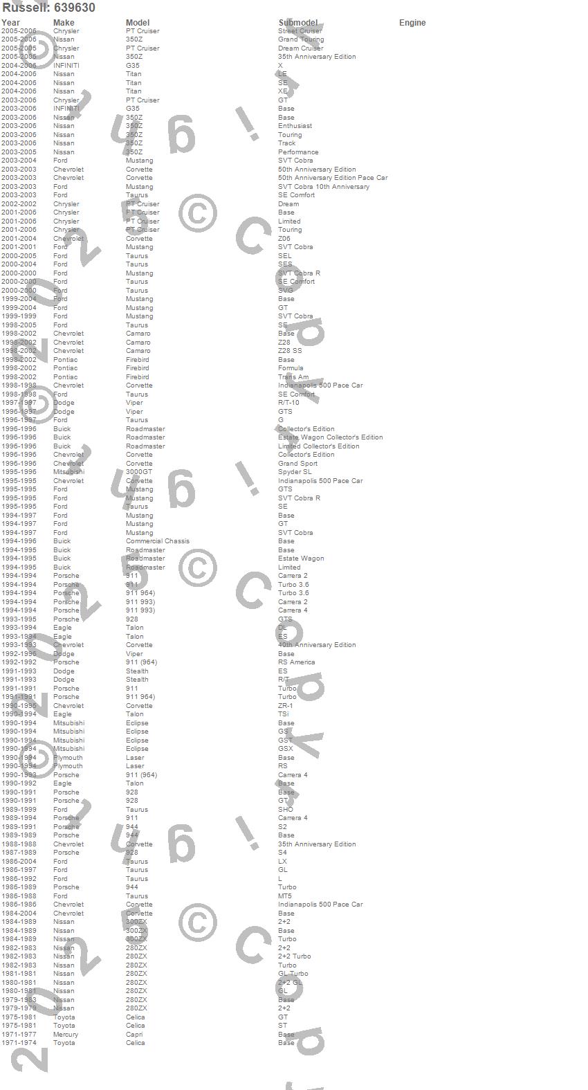 280ZX, 3000GT, 300ZX, 350Z, 911, 928, 944, Camaro, Capri, Celica, Commercial Chassis, Corvette, Eclipse, Firebird, G35, Laser, Mustang, PT Cruiser, Roadmaster, Stealth more...