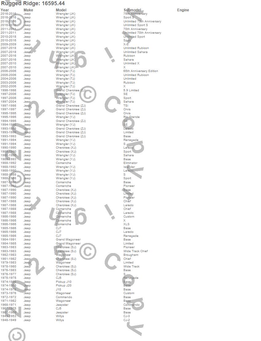 Cherokee (SJ), Cherokee (XJ), CJ-2A, CJ-3A, CJ5, CJ7, Comanche, Grand Cherokee (ZJ), Grand Wagoneer, J10, J20, Jeepster, Wagoneer, Willys, Wrangler (JK), Wrangler (LJ), Wrangler (TJ), Wrangler (YJ), Jeep, 2013 more…