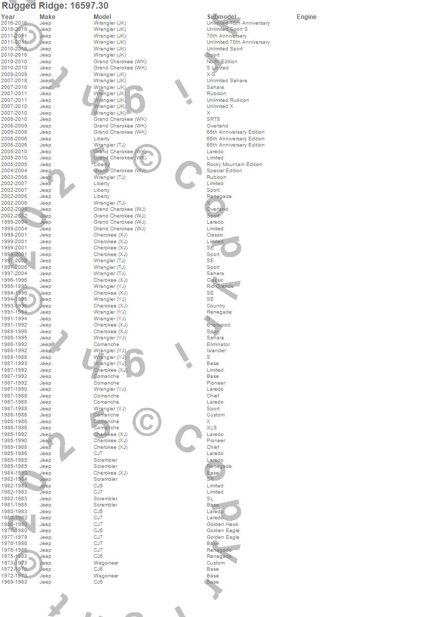 Cherokee (XJ), CJ5, CJ6, CJ7, Comanche, Grand Cherokee (WJ), Grand Cherokee (WK), Liberty, Scrambler, Wagoneer, Wrangler (JK), Wrangler (LJ), Wrangler (TJ), Wrangler (YJ), Jeep, 2015, 2014, 2013, 2012, 2011 more…