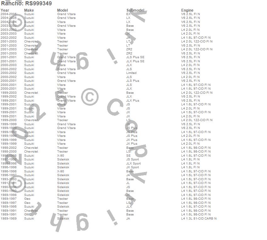 Below is an abreviated list of applications for the RS9000XL Series Suspension Strut Assembly.