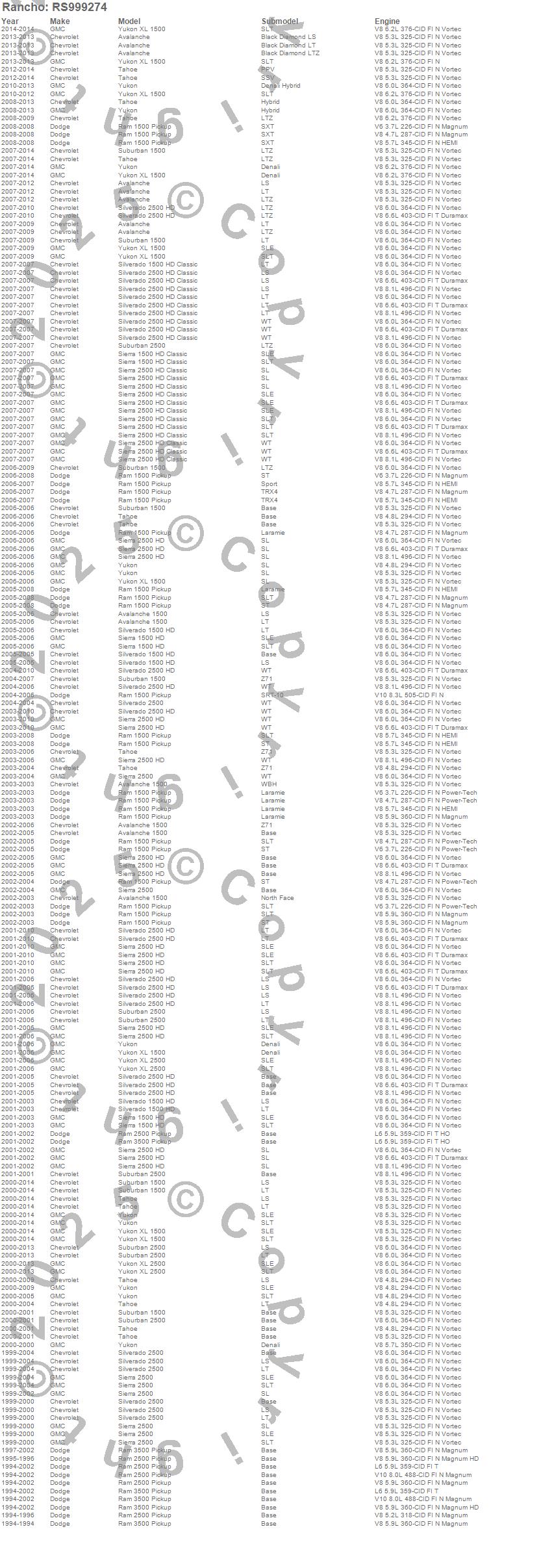 Below is an abreviated list of applications for the RS9000XL Shock Absorber.