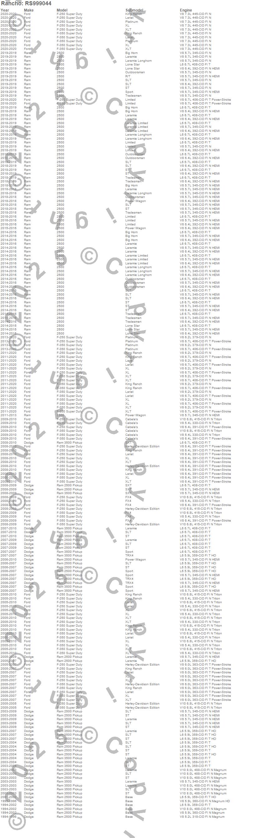 Below is an abreviated list of applications for the RS9000XL Shock Absorber.