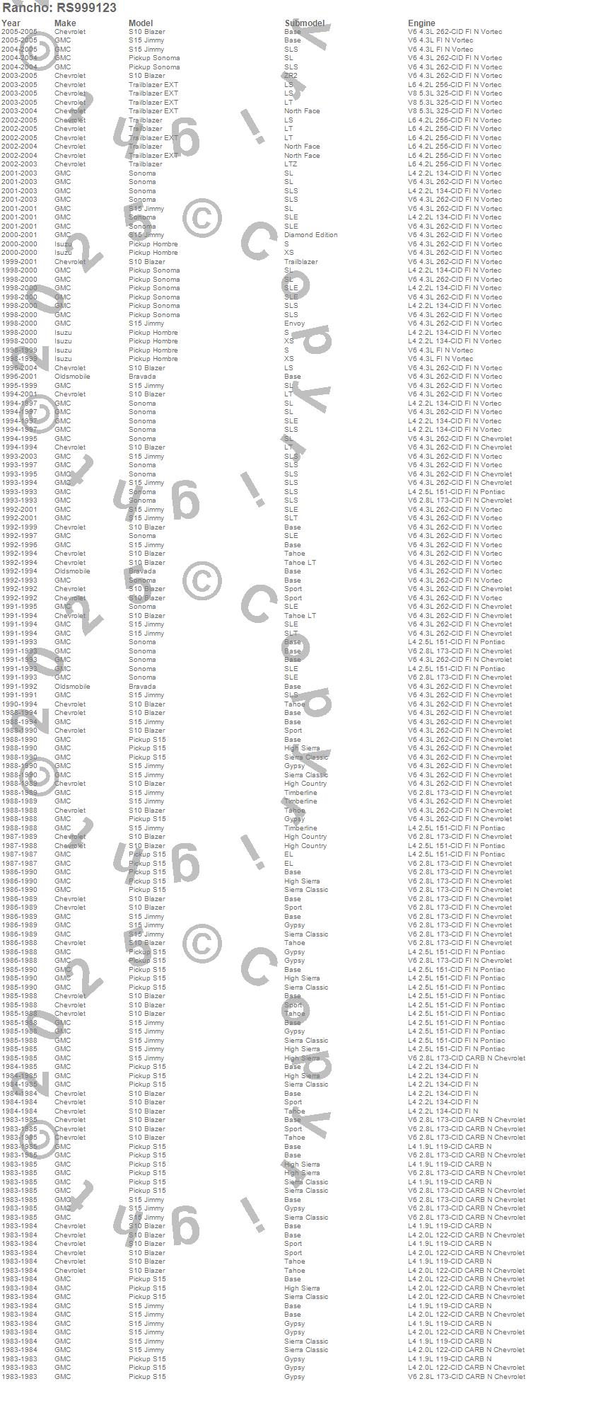 Below is an abreviated list of applications for the RS9000XL Shock Absorber.