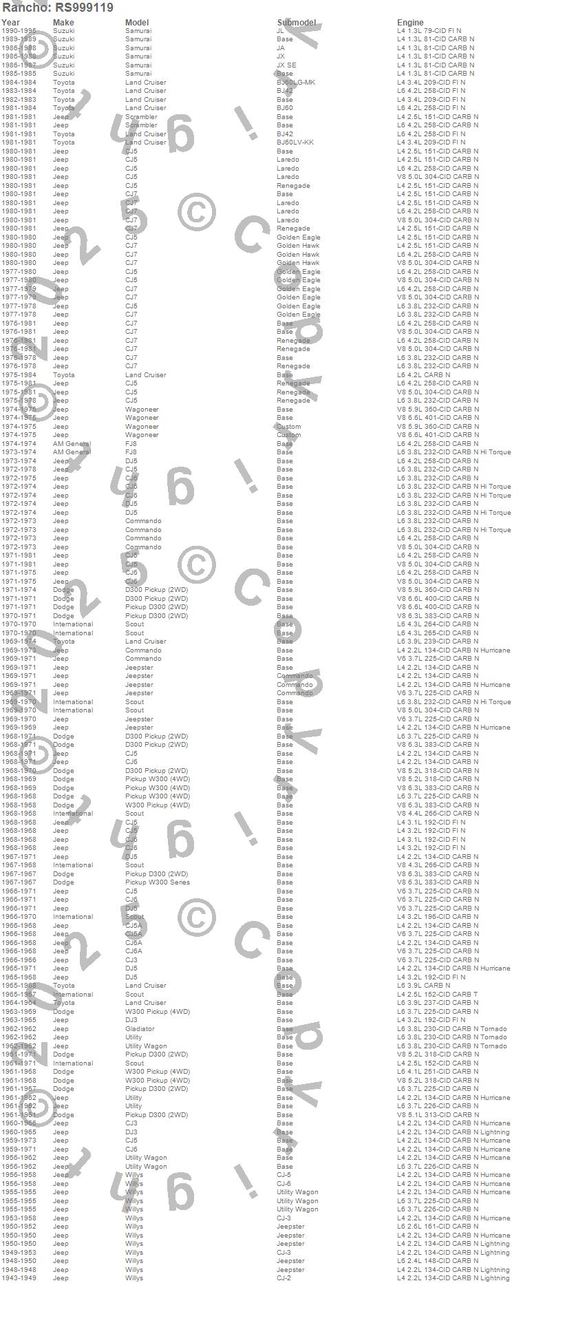 Below is an abreviated list of applications for the RS9000XL Shock Absorber.