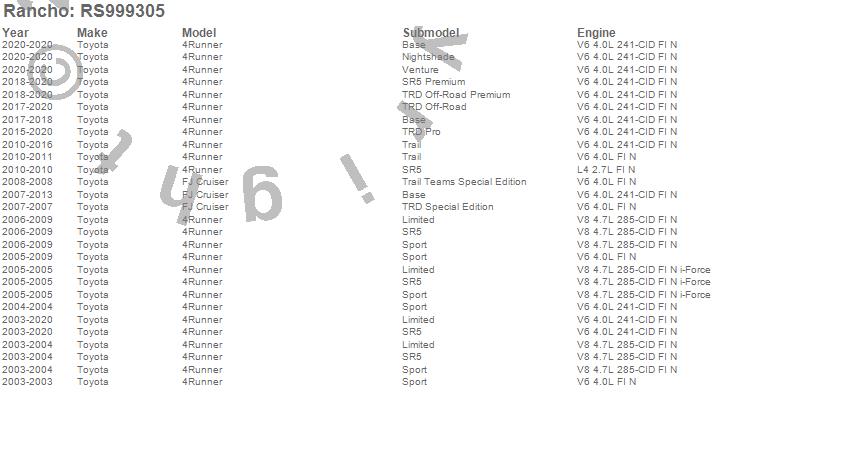 Below is an abreviated list of applications for the RS9000XL Shock Absorber.