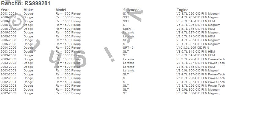Below is an abreviated list of applications for the RS9000XL Shock Absorber.