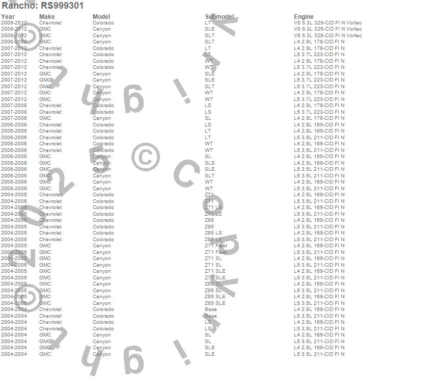 Below is an abreviated list of applications for the RS9000XL Shock Absorber.