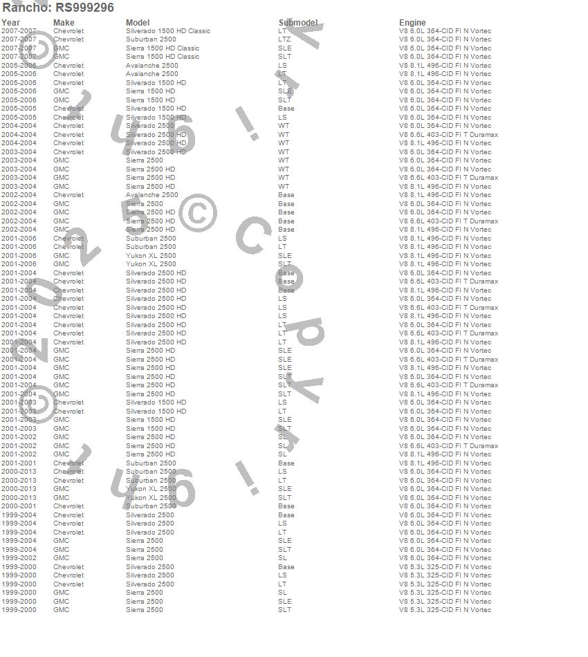Below is an abreviated list of applications for the RS9000XL Shock Absorber.