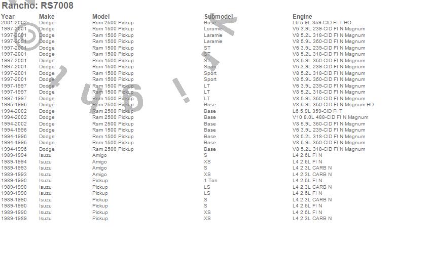 Below is an abreviated list of applications for the RS7000MT Monotube Shock.