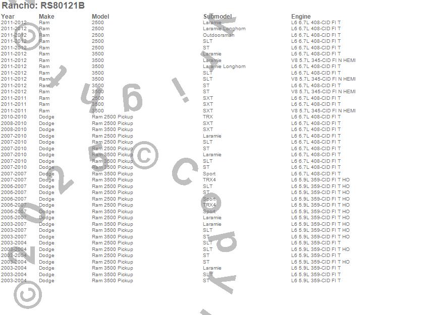 Below is an abreviated list of applications for the Coil Spring Set. 2500, 3500, Ram 2500, Ram 3500, Dodge, Ram, 2012, 2011, 2010, 2009, 2008, 2007, 2006, 2005, 2004, 2003 more…
