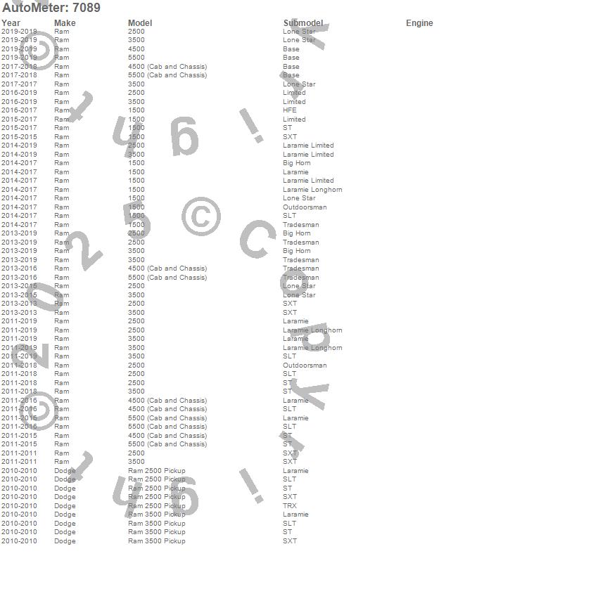 Below is an abreviated list of applications for the Ram Factory Match Triple Pillar Gauge Kit.