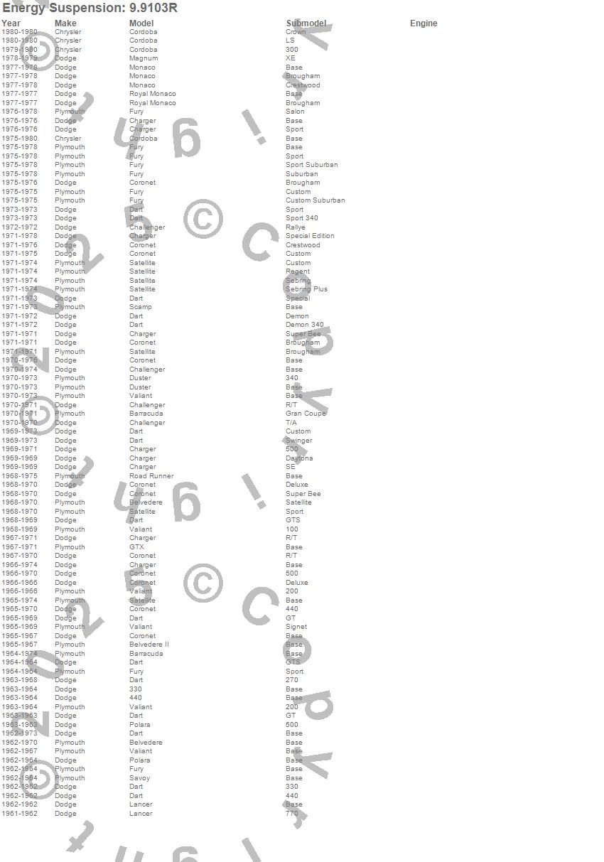 330, 440, Barracuda, Belvedere, Belvedere II, Challenger, Charger, Cordoba, Coronet, Dart, Duster, Fury, GTX, Lancer, Magnum, Monaco, Polara, Road Runner, Royal Monaco, Satellite more…