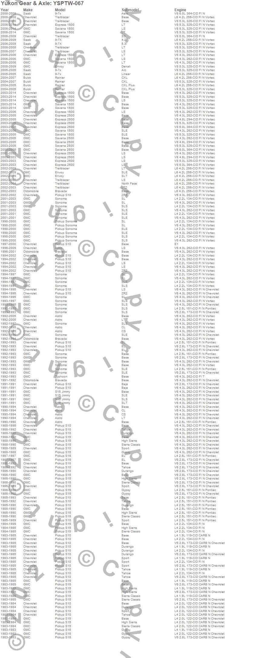 Astro, Bravada, Envoy, Envoy XL, Envoy XUV, Express 1500, Express 2500, S10 Blazer, S10 Blazer (Canadian), S10 Pickup, S15 Jimmy, S15 Pickup, Safari, Savana 1500, Savana 2500, Sonoma, Trailblazer, Trailblazer EXT, Typhoon, Chevrolet more…