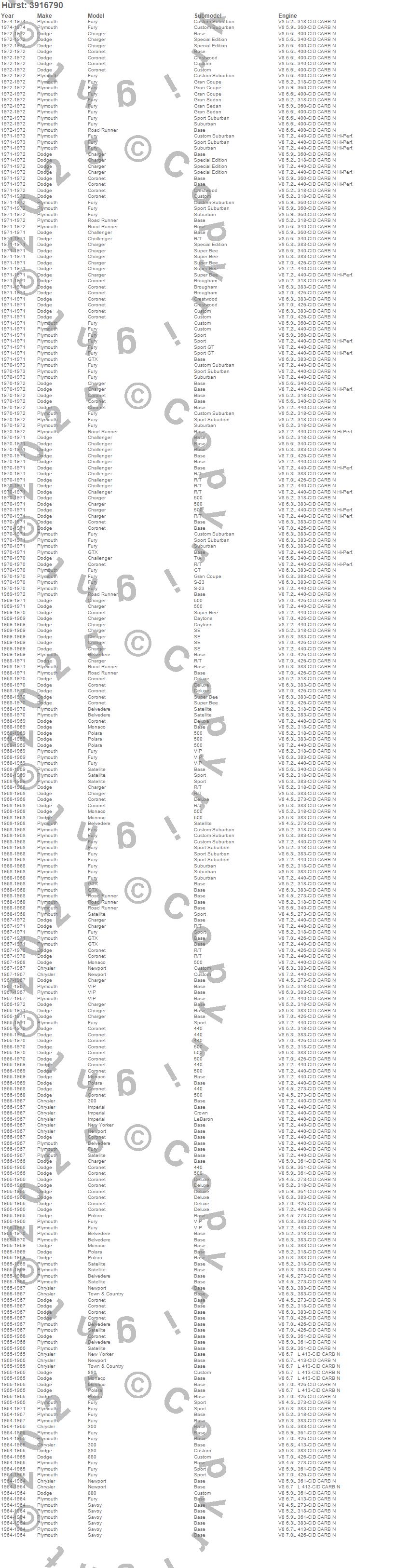 300, Belvedere, Challenger, Charger, Coronet, Custom, Fury, GTX, Imperial, Monaco, New Yorker, Newport, Polara, Road Runner, Satellite, Savoy, Town & Country, VIP, Chrysler, Dodge more…