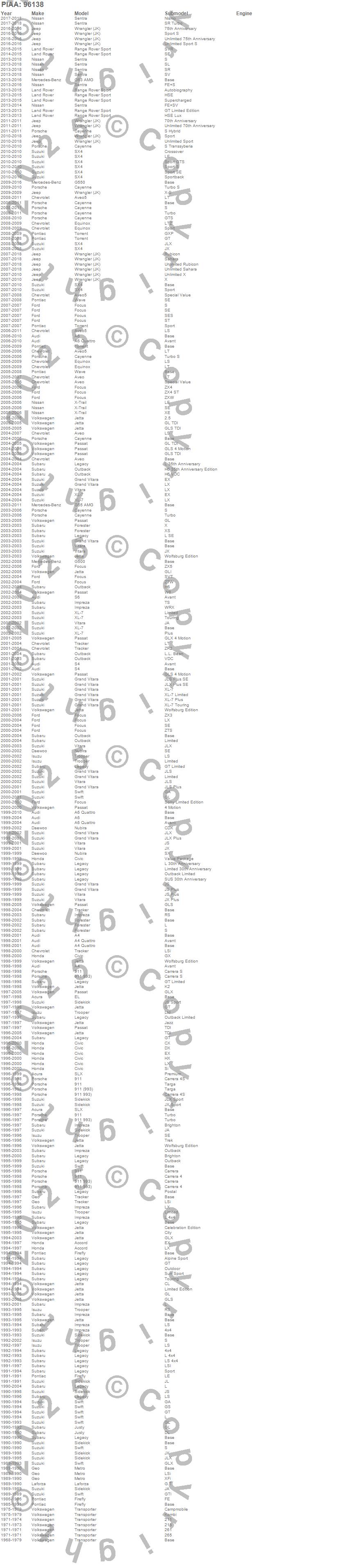 Below is an abreviated list of applications for the Aero Vogue Premium Hybrid Silicone Wiper Blade.