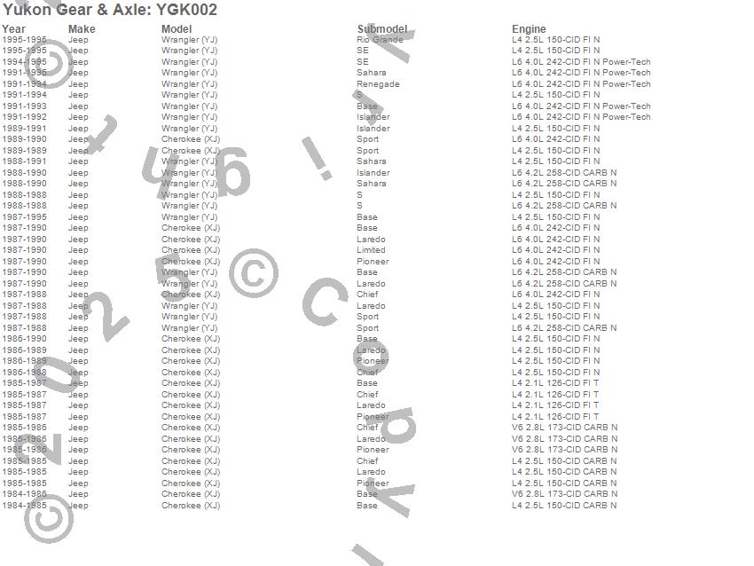 Below is an abreviated list of applications for the Yukon Gear And Install Kit.