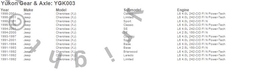 Below is an abreviated list of applications for the Yukon Gear And Install Kit.