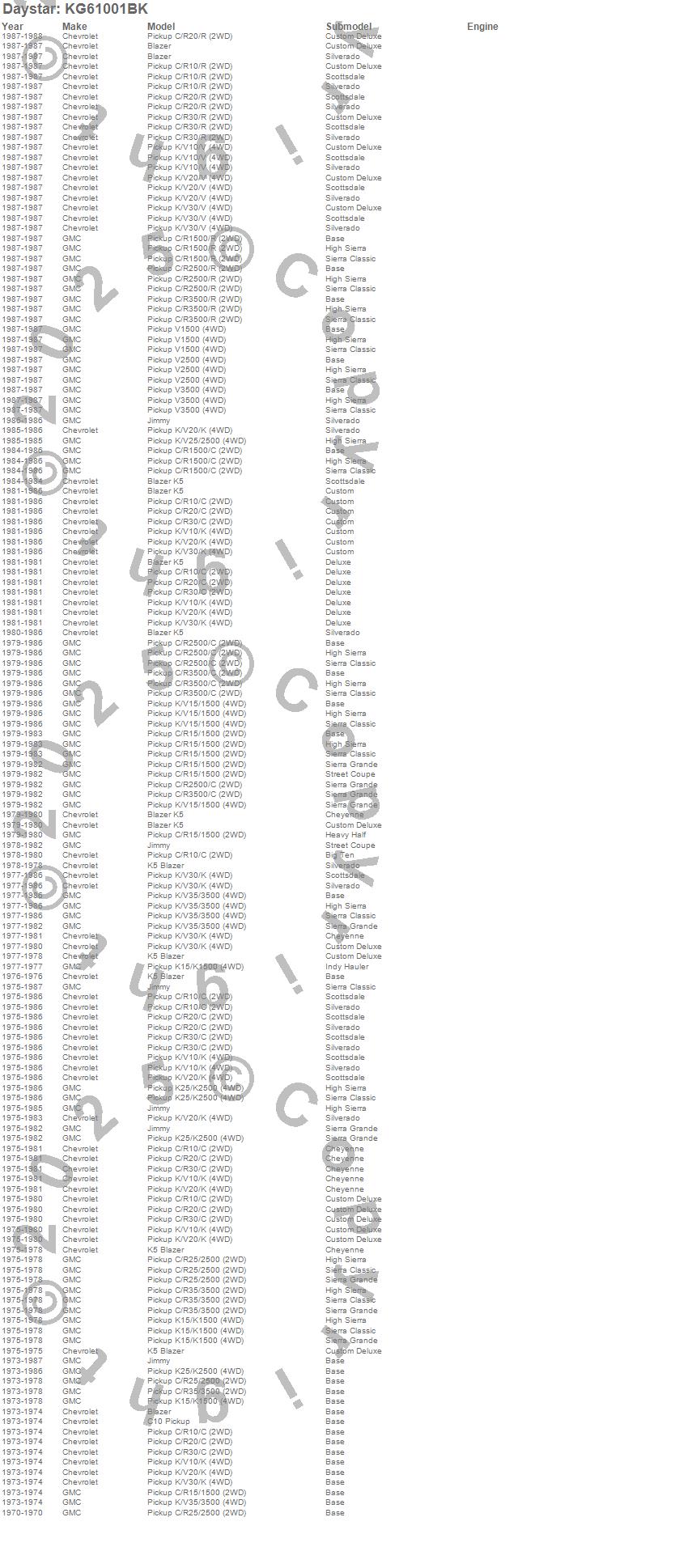 Blazer, Blazer K5, C10 Pickup, C15/C1500, C1500, C20 Pickup, C25/C2500 Pickup, C2500 Pickup, C30 Pickup, C35/C3500 Pickup, C3500 Pickup, Jimmy, K10 Pickup, K15/K1500, K1500, K20 Pickup, K25 Pickup, K25/K2500 Pickup, K2500 Pickup, K30 Pickup more…