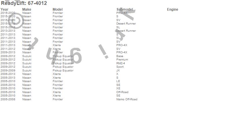Below is an abreviated list of applications for the Bump Stop. Equator, Frontier, Xterra, Nissan, Suzuki, 2013, 2012, 2011, 2010, 2009, 2008, 2007, 2006, 2005 more…